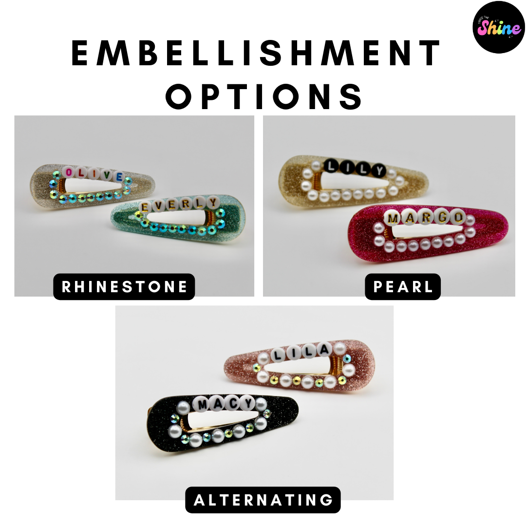 Add a touch of personalized glamour to your hairstyle with our stunning customized sparkly barrette! Handcrafted with care, this elegant hair accessory allows buyers to choose between lustrous pearls, dazzling rhinestones, or a beautiful combination of both, creating a unique and eye-catching piece. Elevate any outfit or special occasion look with this versatile barrette that is sure to be a standout addition to your accessory collection. Perfect for gift-giving or treating yourself to a touch of sparkle, this barrette will add a touch of luxury to any hairdo.